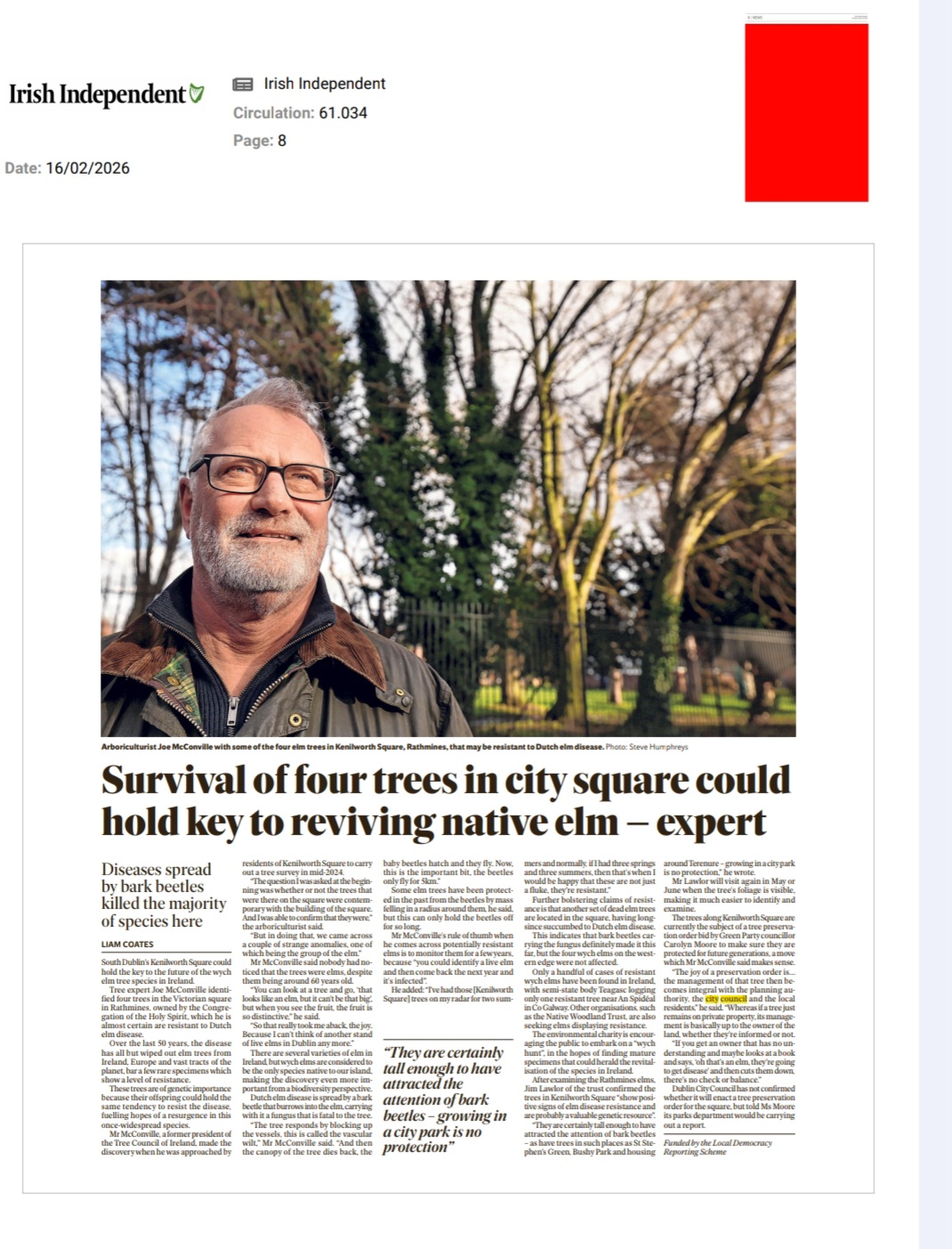 The public are asked to report any similar trees through out Ireland. It is hoped that these trees resistant to Dutch elm disease. These trees are of genetic importance because their offspring could hold the same tendency to resist the disease, fuelling hopes of a resurgence in this once-widespread species.Mr McConville, a former president of the Tree Council of Ireland, made the discovery when he was approached by residents of Kenilworth Square to carry out a tree survey in mid-2024.